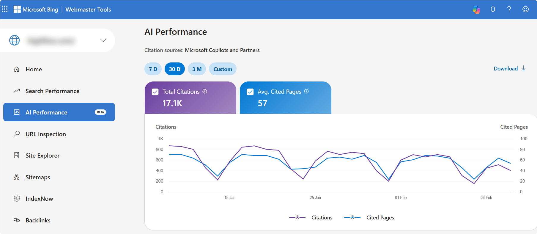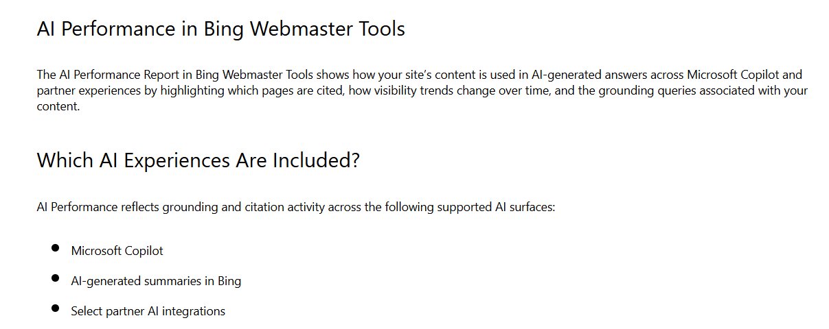2026年2月11日,微软在必应网站管理员工具中引入AI性能板块:一组全新的数据洞察,展示网站内容在微软Copilot、必应AI生成摘要以及特定合作伙伴集成中的呈现情况。