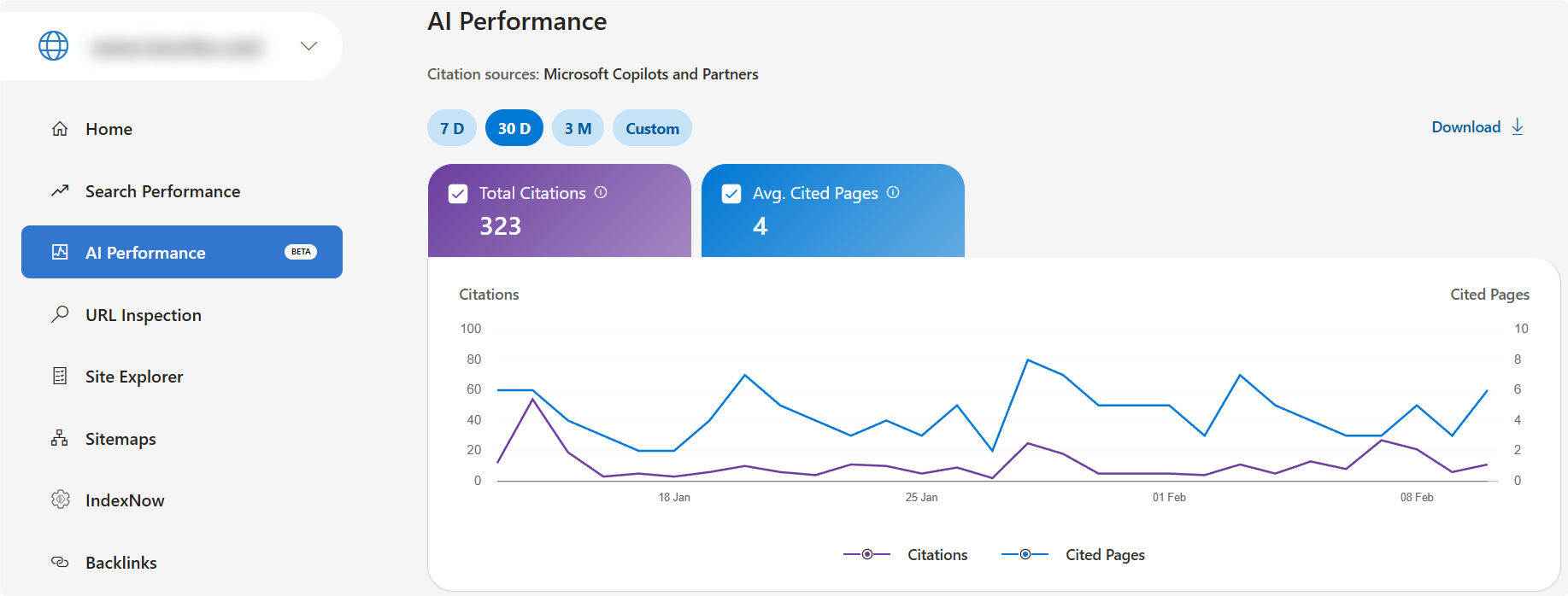 必应网站管理员工具的AI绩效报告可清晰呈现你的网站内容在微软Copilot及合作伙伴AI体验中的引用情况。报告重点展示哪些页面被引用、可见度趋势如何变化,以及与内容相关的溯源查询词。