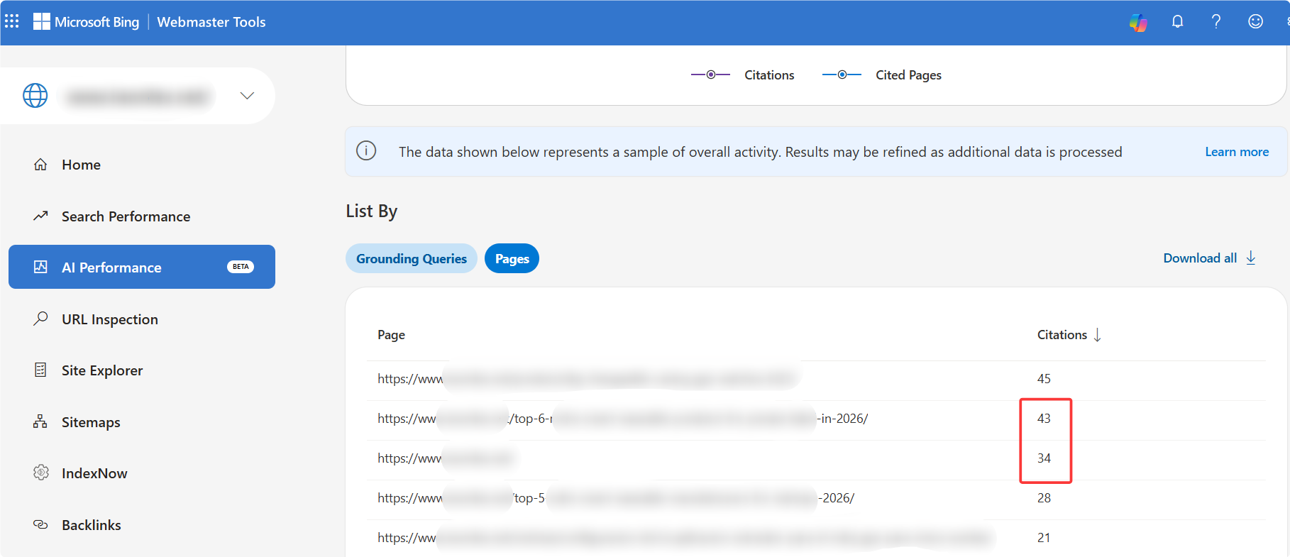 AI绩效数据经过汇总和采样处理,旨在提供受支持AI场景中引用活动的代表性视图,并非每一次内容被引的完整记录。